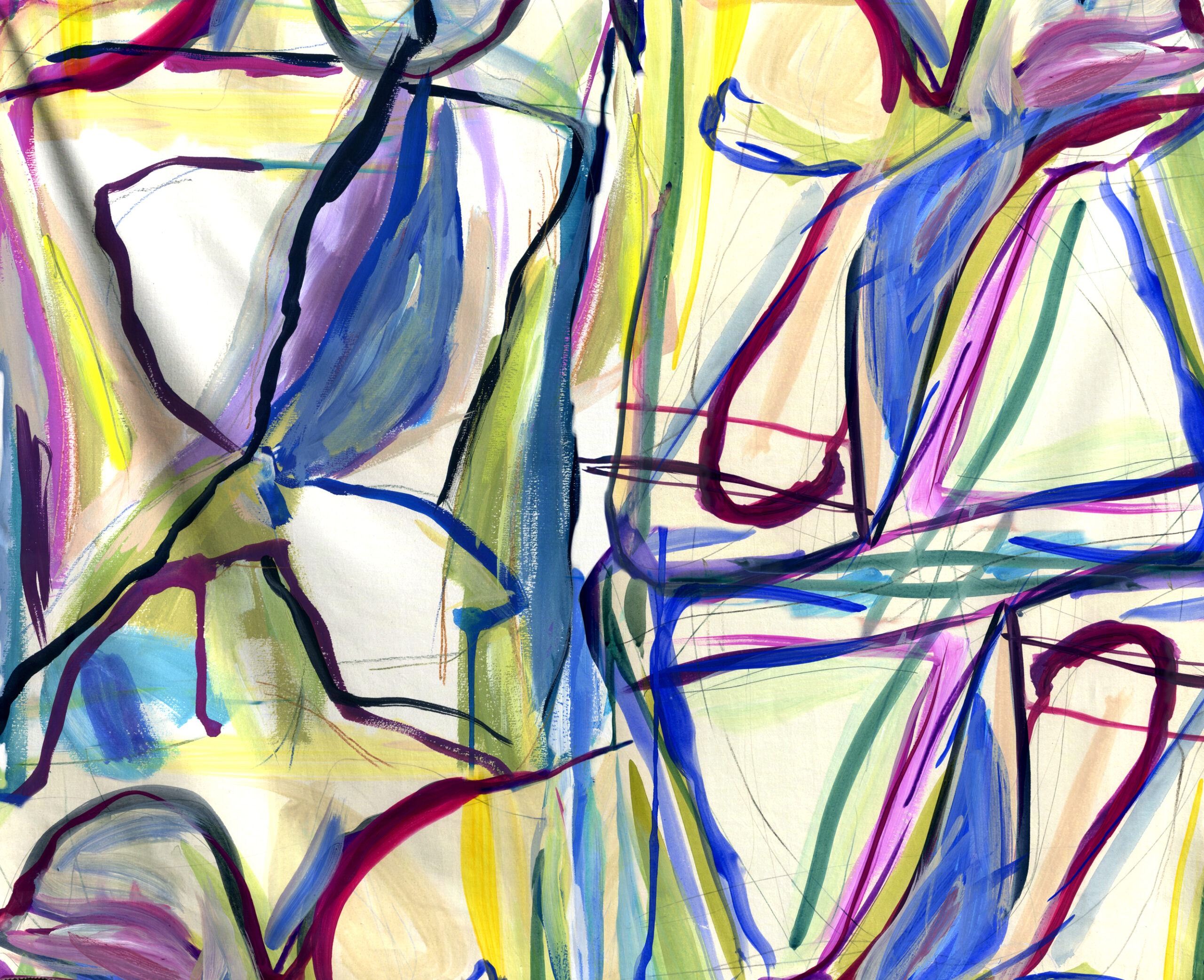 Imprimé pensé comme une grande toile d’artiste, peint à la gouache en laissant libre cours aux vibrations de la couleur, par le pinceau et par le geste.