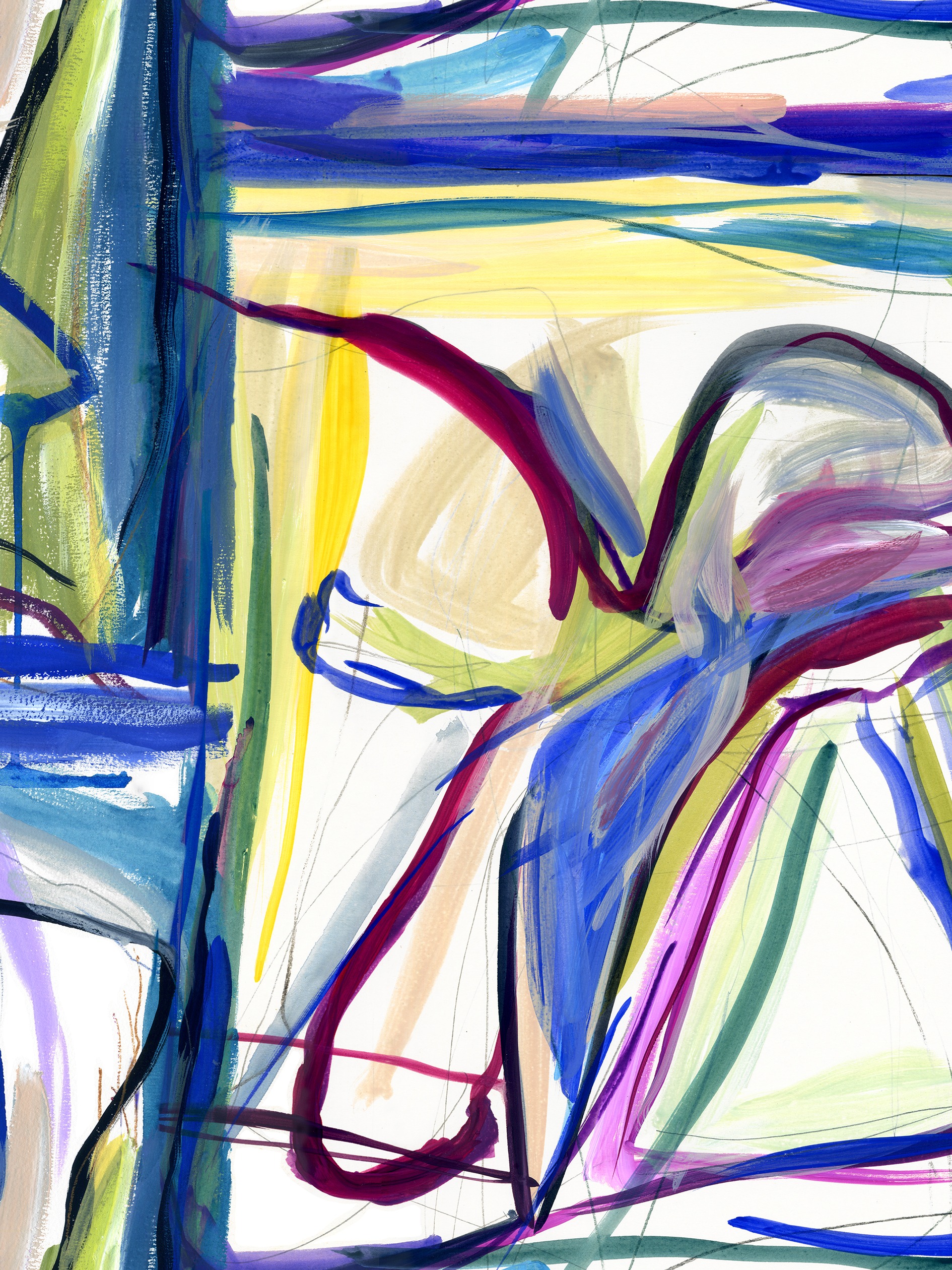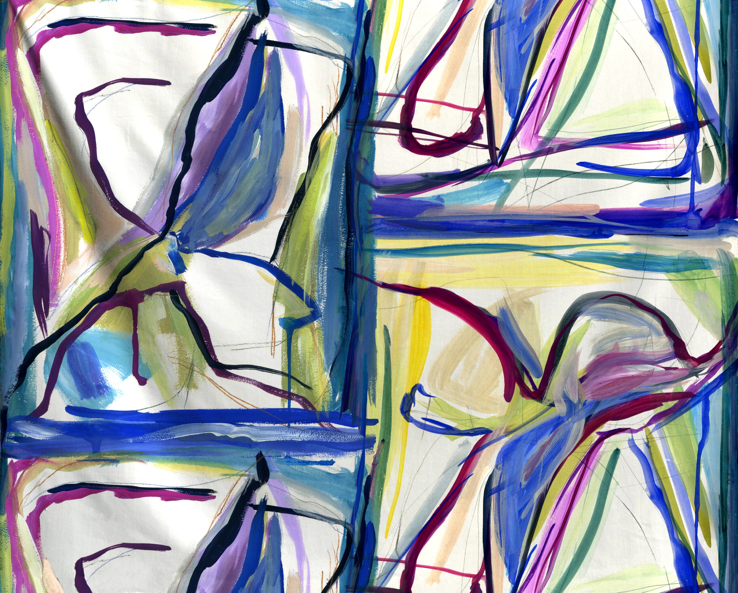 Imprimé peint à la gouache en laissant libre cours aux vibrations de la couleur, par le pinceau et par le geste.